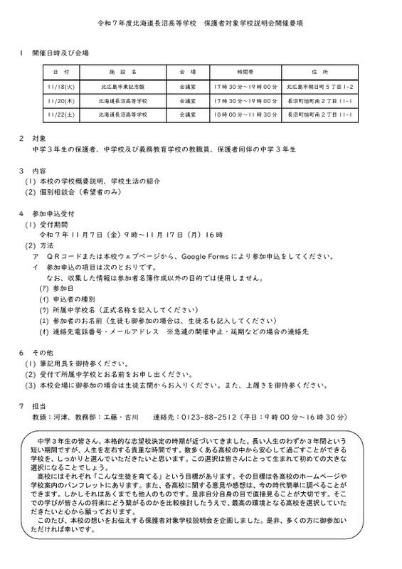 11/20(木) 17時30分~19時00分 北海道長沼高等学校